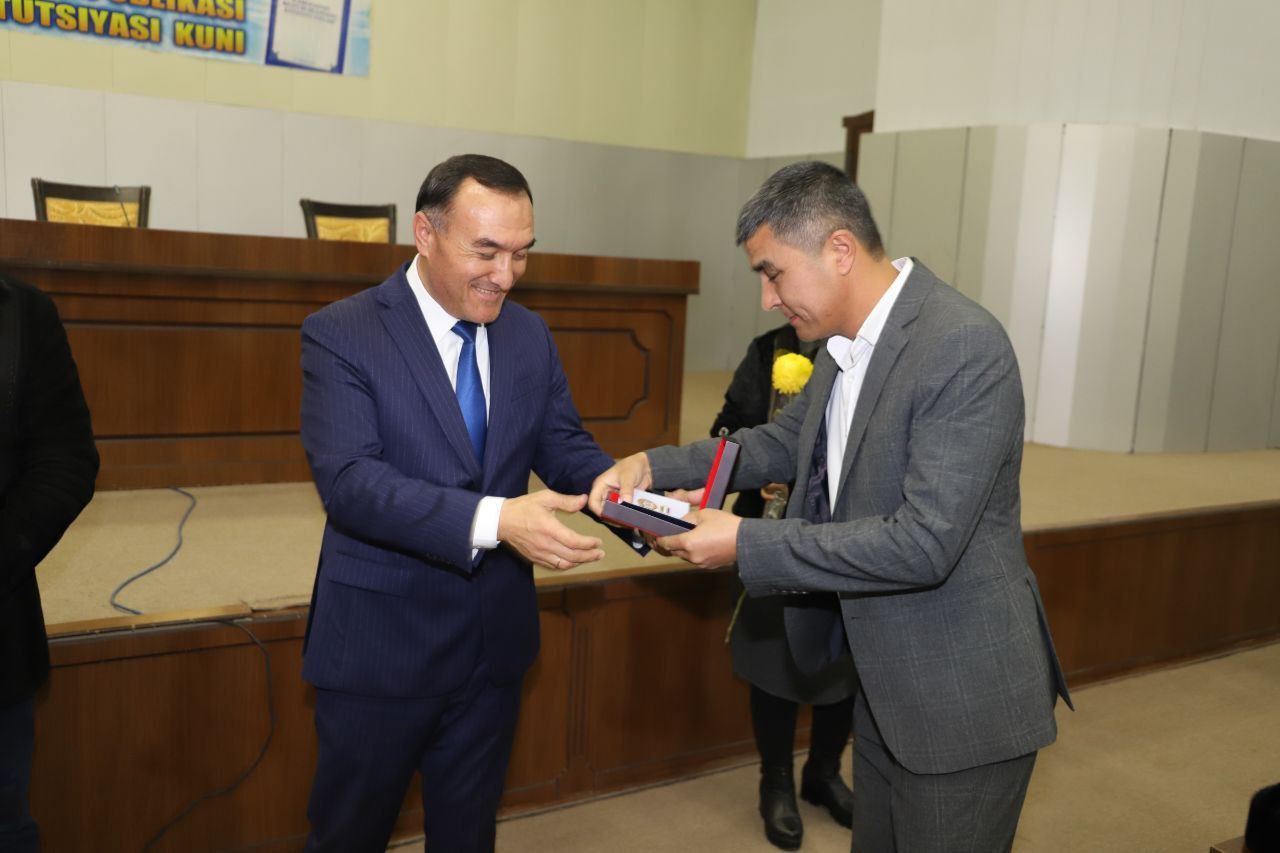 Шундан сўнг тадбирда барча соҳаларда фидоийлик билан меҳнат қилаётган, мамлакатимиз мустақиллигини мустаҳкамлаш, унинг иқтисодий, сиёсий, ижтимоий, илмий, маънавий салоҳиятини юксалтириш, мудофаа қудратини оширишга муносиб ҳисса қўшиб келаётган 110 нафар юртдошларимиз, меҳнат фахрийлари Конституциямиз қабул қилинганлигининг 30 йиллиги муносабати билан таъсис этилган кўкрак нишони билан тақдирландилар.