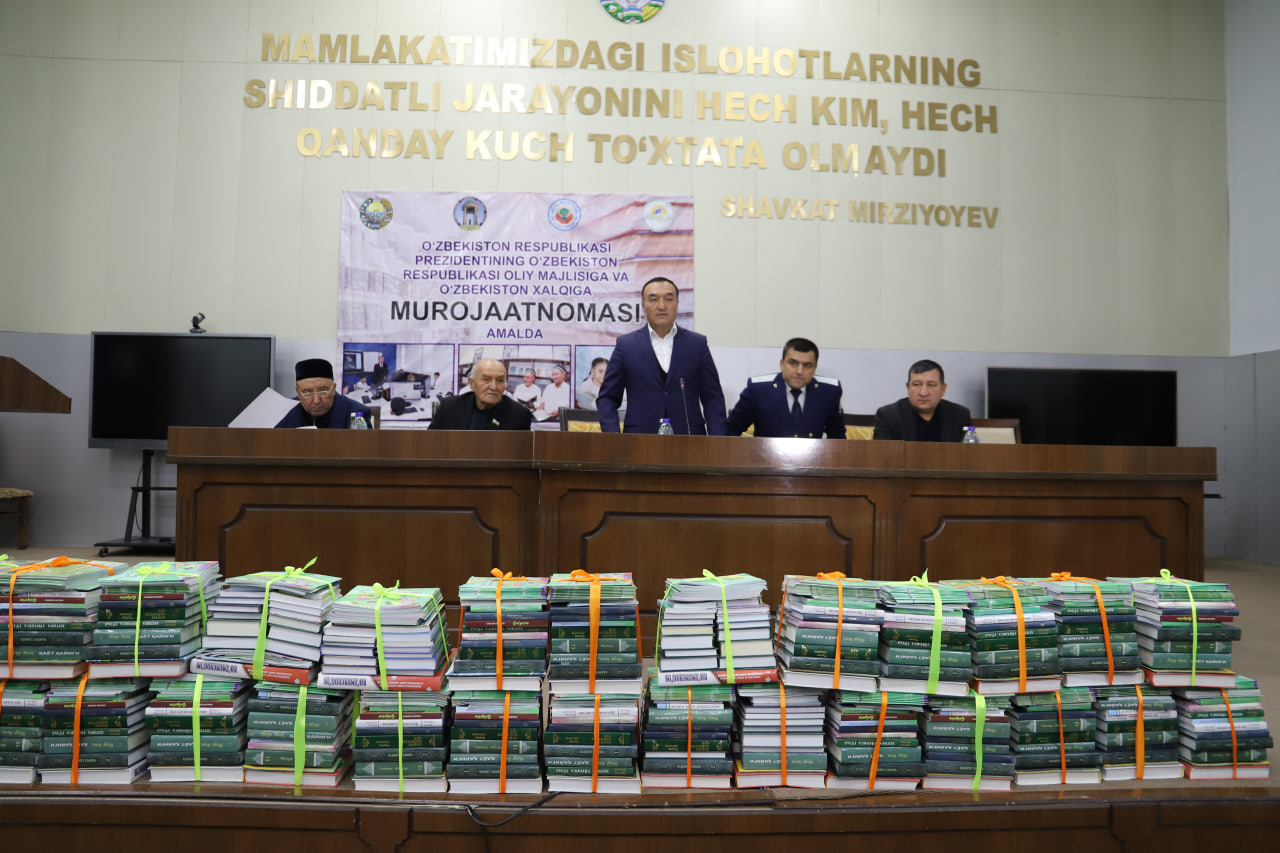 Китоблар тақдимотида сенатор Икромхон Нажмиддинов, вилоят Маҳалла ва нуронийларни қўллаб-қувватлаш бошқармаси бошлиғи Аҳмаджон Алоходжаев, Республика Маънавият ва маърифат Маркази вилоят бўлими раҳбари Мусохон Аппақов, “Маҳалла” хайрия жамоат фонди вилоят бўлими раиси Аҳмаджон Мукаррамов, туман ҳокими Асадулла Нажмиддинов ва тумандаги ташкилотлар раҳбарлари иштирок этдилар.