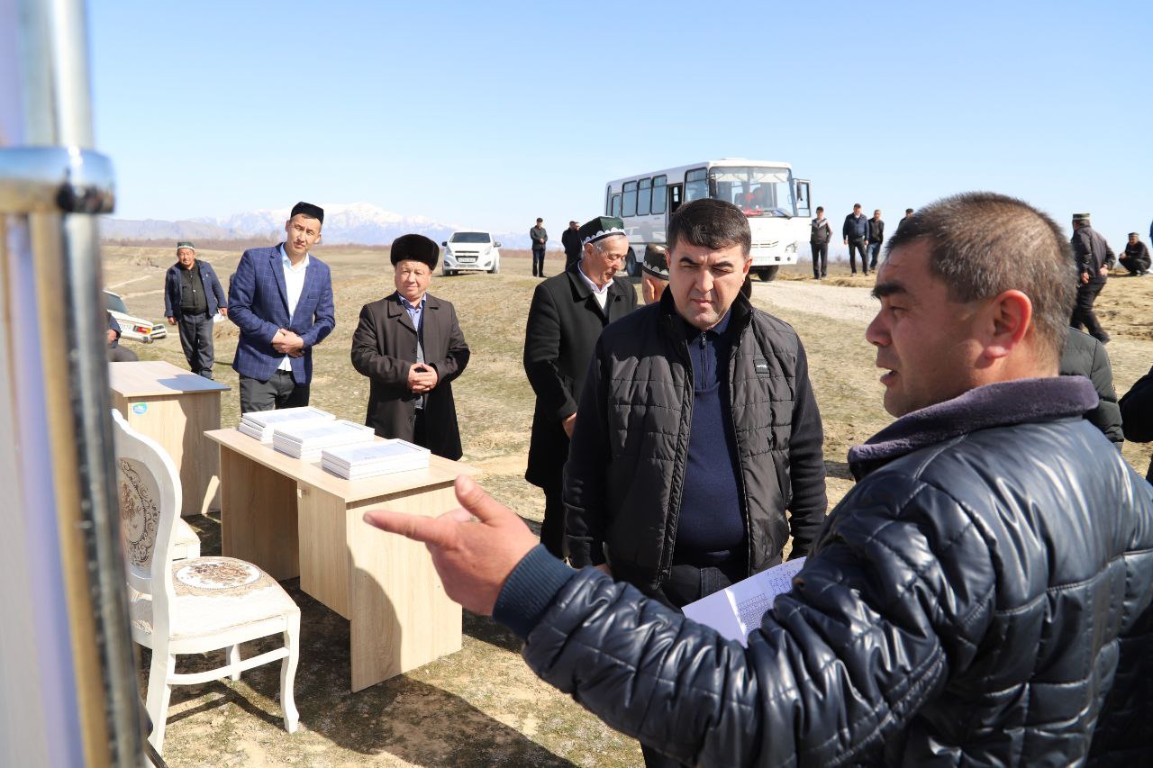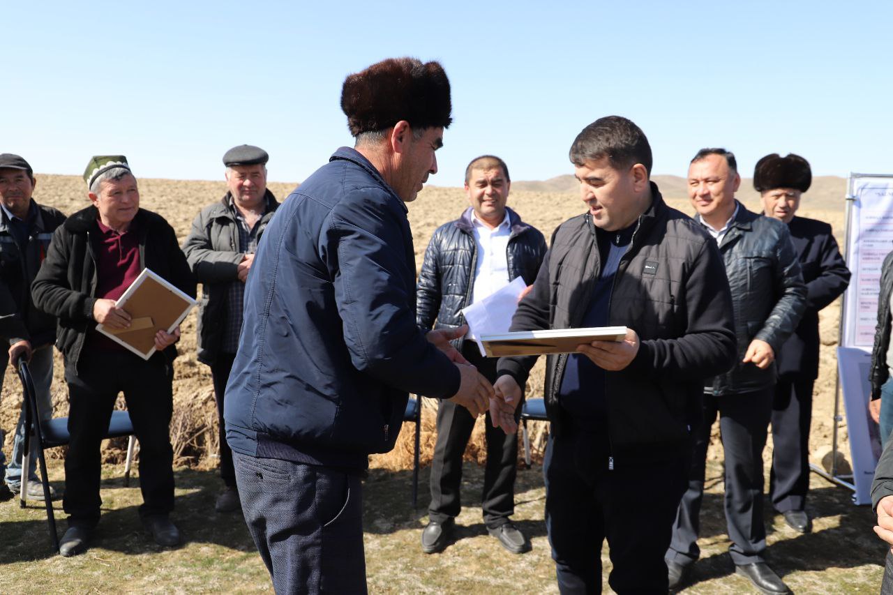 Вилоят ҳокими ушбу манзилда ер ажратилган фуқароларга сертификатларни топширди, келгусида дехқончилик орқали юқори ҳосил олишларини тилади.