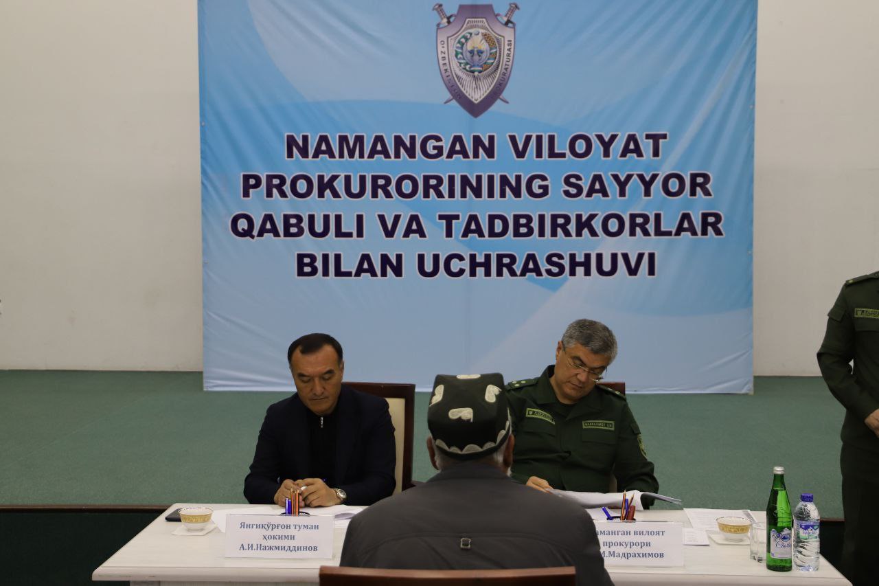 Наманган вилояти прокурори У.Мадрахимов бошчилигида аҳоли билан бевосита ва очиқ мулоқот қилиш, мавжуд муаммоларни аниқлаш ҳамда уларни жойида бартараф этиш мақсадида Янгиқўрғон туманида сайёр қабул ўтказилди.