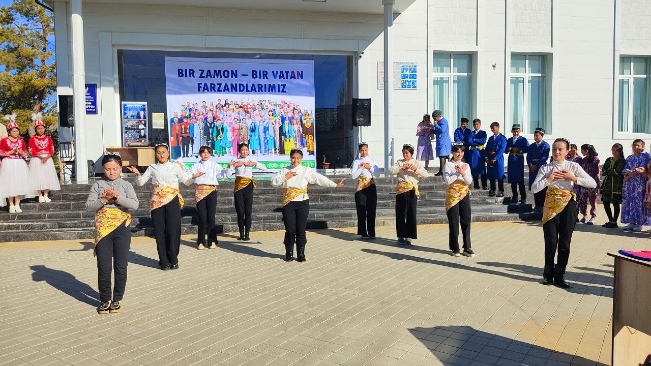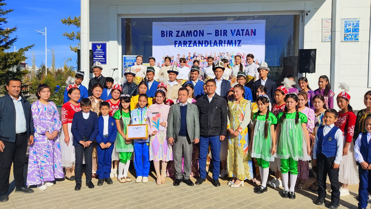 Туман ҳокимлиги, туман Мактабгача ва мактаб таълими бўлими ҳамкорлигида ташкил этилган тадбирда қирғиз ва ўзбек миллатига мансуб ўқувчи ёшлар ўз чиқишлари, саҳна кўринишлари билан мамлакатимизда миллатлараро тотувлик, бағрикенгликка қаратилаётгани эътибор туфайли бир замонда, бир Ватанда бирдамликда, ҳамжихатликда турмуш кечираётганликларини яна бир бор намойиш этдилар.