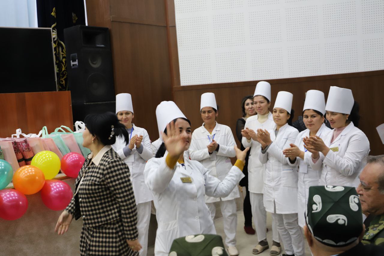 Шунингдек, туман Тиббиёт бирлашмаси бош шифокори Лайлохон Ахмедова ҳозирда намунали фаолият юритаётган шифокорлар, ўрта ва кичик тиббиёт ходимларини сана билан муборакбод этиб, туман ва вилоят мутасадди ташкилотларининг, Тиббиёт ходимлари касаба уюшмасининг Фахрий ёрлиқлари, эсдалик совғалари ва пул мукофотлари билан тақдирлади.
